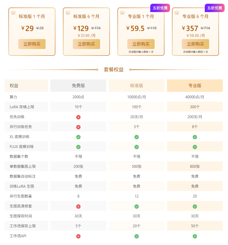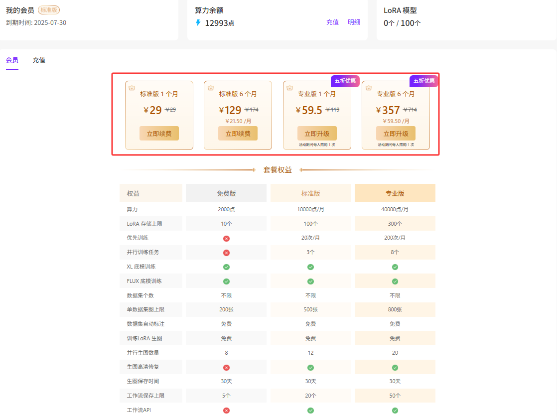 - 标准版支持升级成专业版,升级后立即生效,且权益算力叠加(标准版的剩余可用算力累加,其他权益以专业版上限为准),支持续费操作