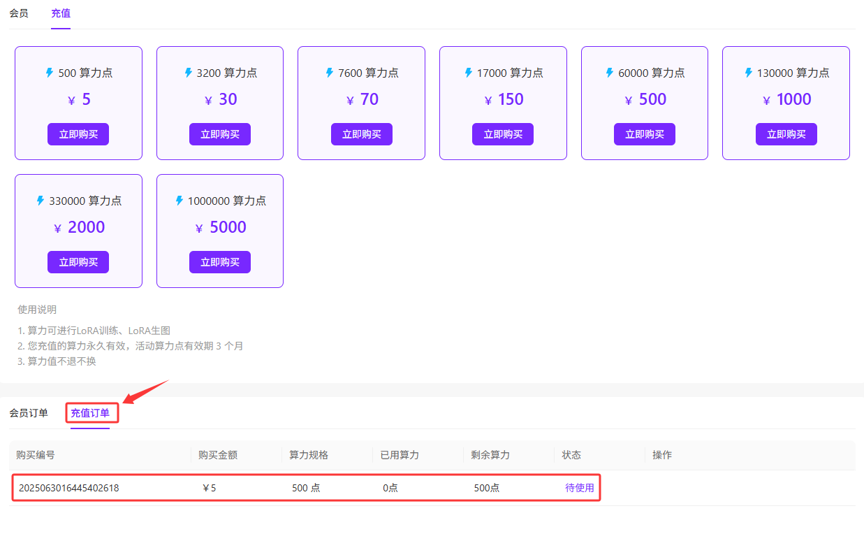 1.购买后可在下方的【充值订单】中查看订单购买明细。