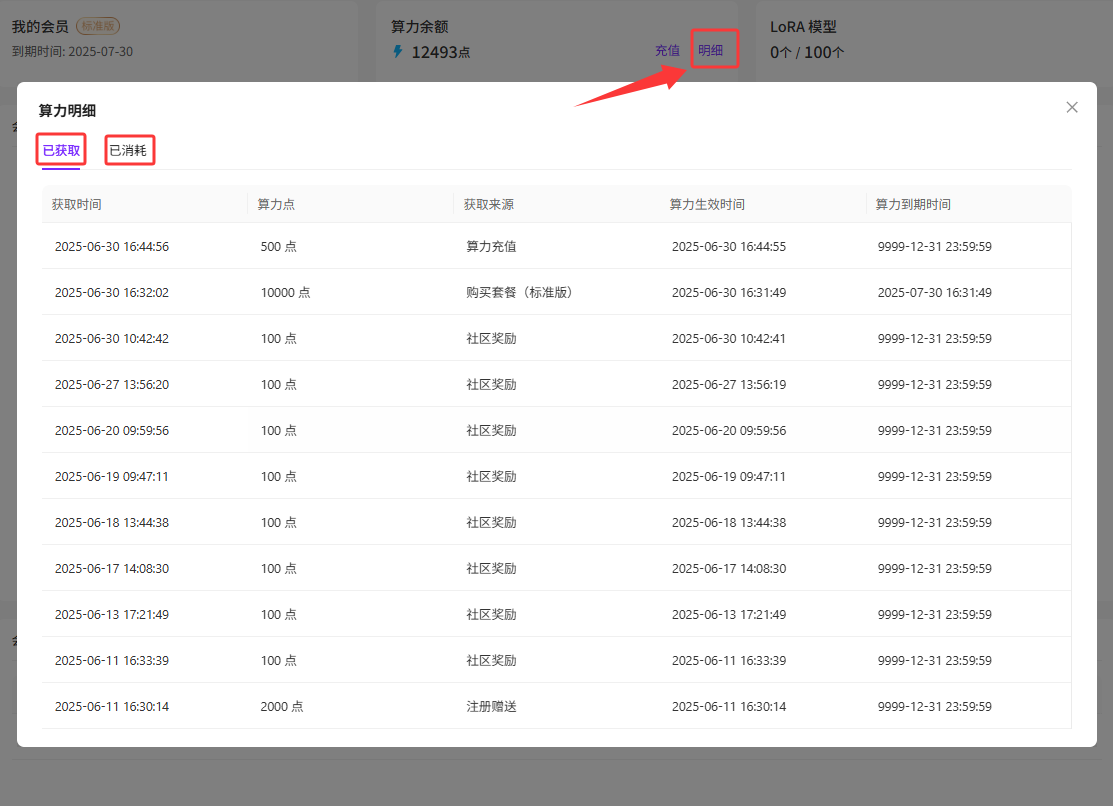 2.点击算力余额的【明细】可以查看【算力明细】,包括已获取的算力和已消耗的算力