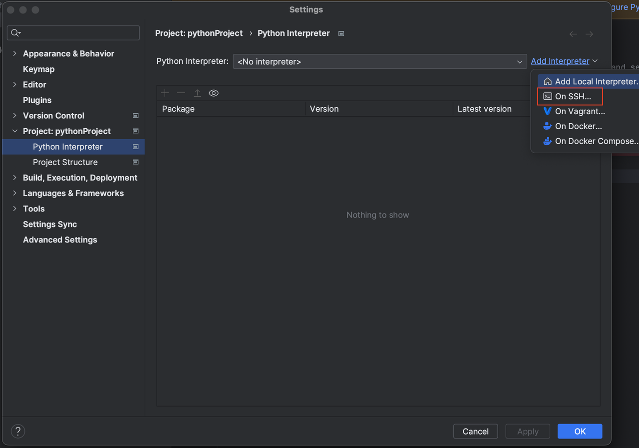 选择 SSH Interpreter。若 PyCharm 版本不一致,需要您选择协议时,请选 SSH 协议。