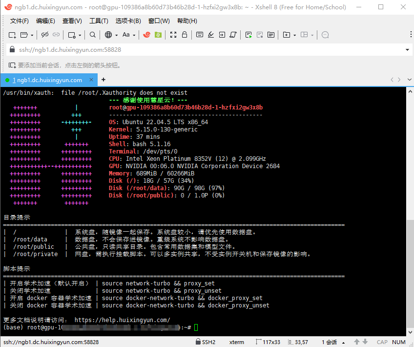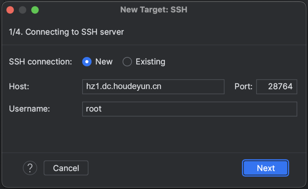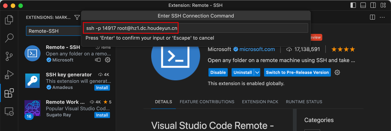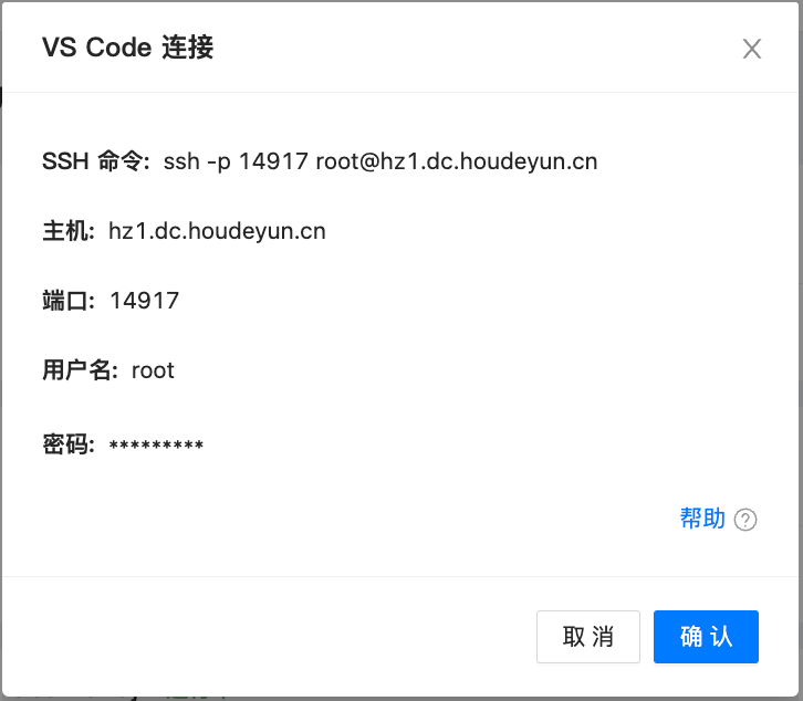 ssh -p 14917 root@hz1.dc.houdeyun.cn。回车键继续操作。注意,请确保命令尾部没有多余空格,否则可能无法登录。