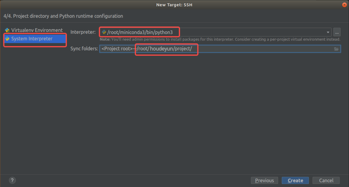 /root/miniconda3/bin/python(如果您安装了其他Python或虚拟环境则根据实际情况填写)配置同步目录,即本地项目和远程实例中的文件目录进行同步,PyCharm 的默认路径是 /tmp/ 下的一个随机目录,推荐将这个目录设置到 /root/houdeyun/project 中。