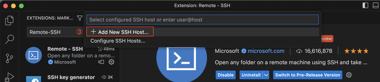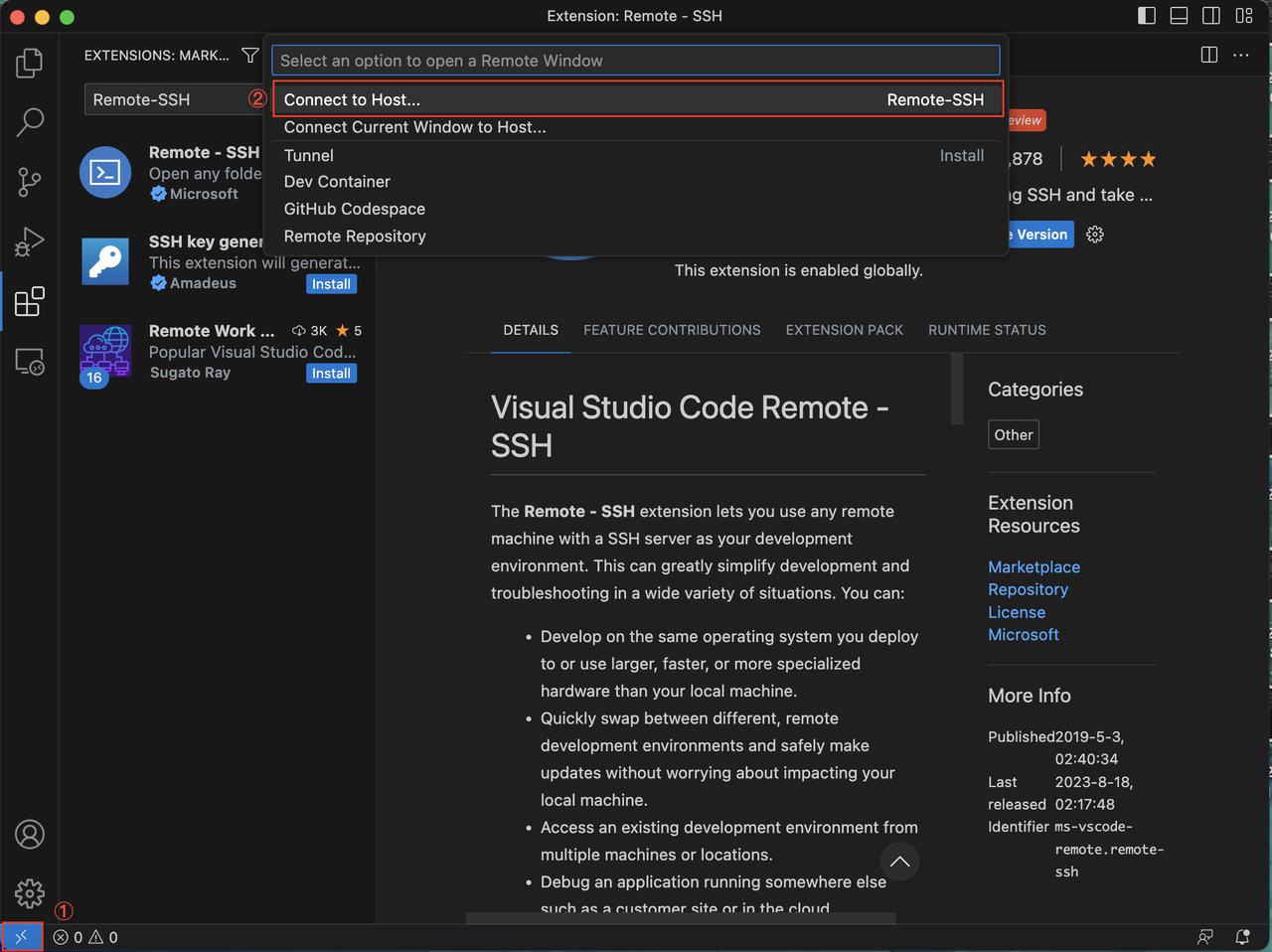 如果您本地 VSCode 开发工具已安装 Remote-SSH,可跳过此步骤。