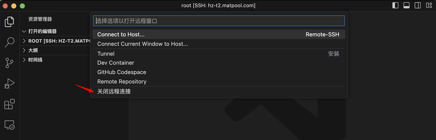 如果您要断开 VS Code 的远程连接,可点击左下角后,点击"关闭远程连接"选项。