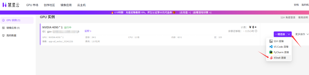 从控制台复制实例的 SSH 登陆命令,注意,针对不同的实例该命令是不一样的。