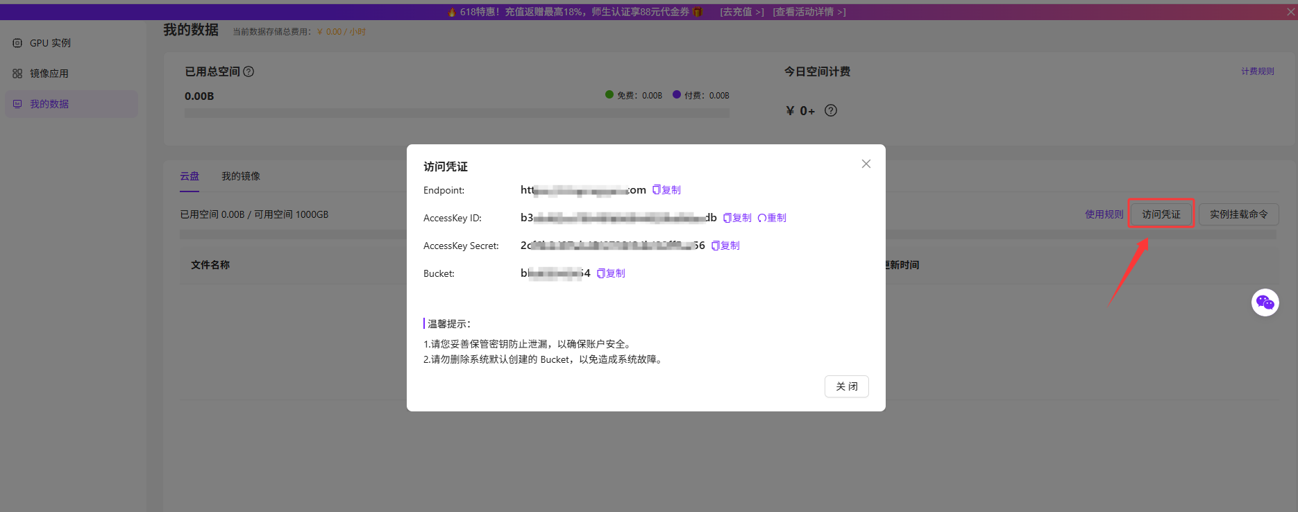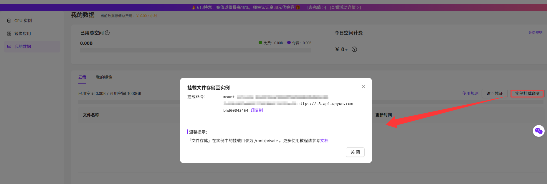 我的数据需自行挂载对象存储免费 5 GB,超出部分每G 0.0004元/小时包含「云盘」和「我的镜像」两部分。欠费后不允许上传数据,欠费第15天会自动清空数据。