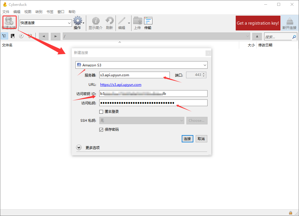 3、下载 并登录 Cyberduck(支持Windows、Mac) ,或其他支持使用 S3 协议访问的客户端;注意区分不同区域的主机名,并且请勿带上“https://”前缀