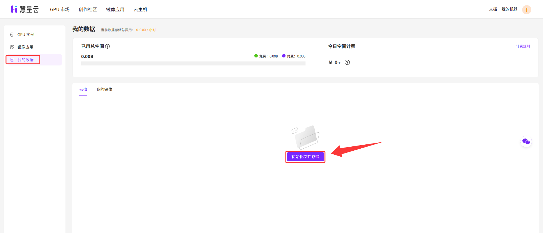 慧星云提供了我的数据,用于存放一些临时训练数据、保存的自定义镜像以及数据备份。包含「云盘」和「我的镜像」两部分,支持将「云盘」挂载到实例中,建立实例与实例间的共享文件通道。慧星云为每个账号提供了 5GB 免费空间,超出部分将按量计时结算。如果发生欠费,将不允许上传数据和保存镜像,并且从欠费算起第 15 天将会清空存储数据。