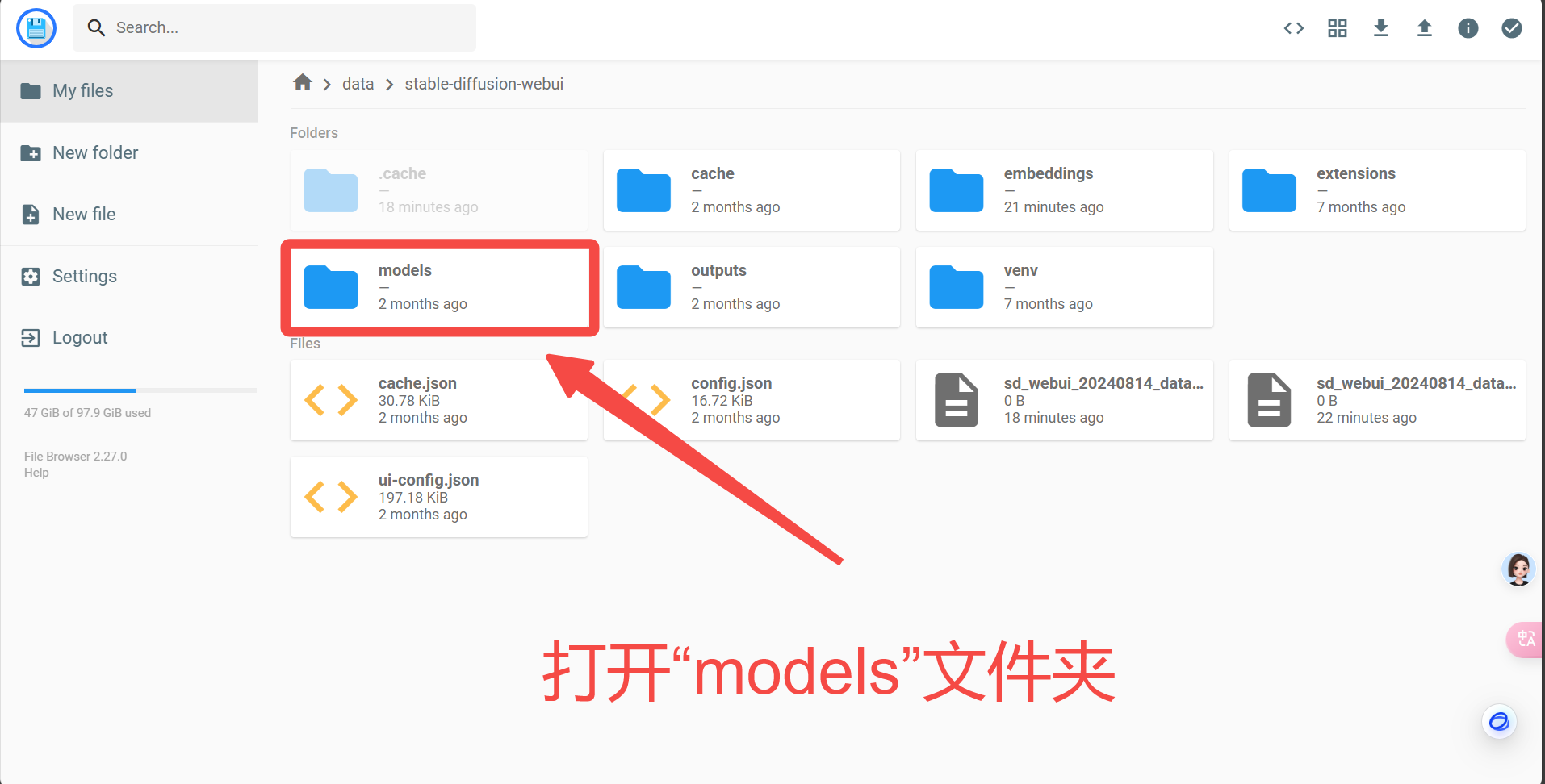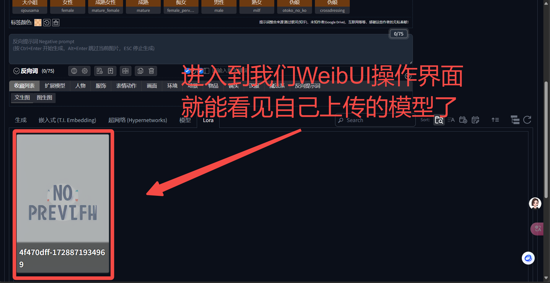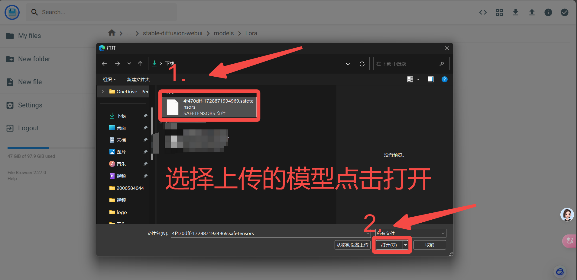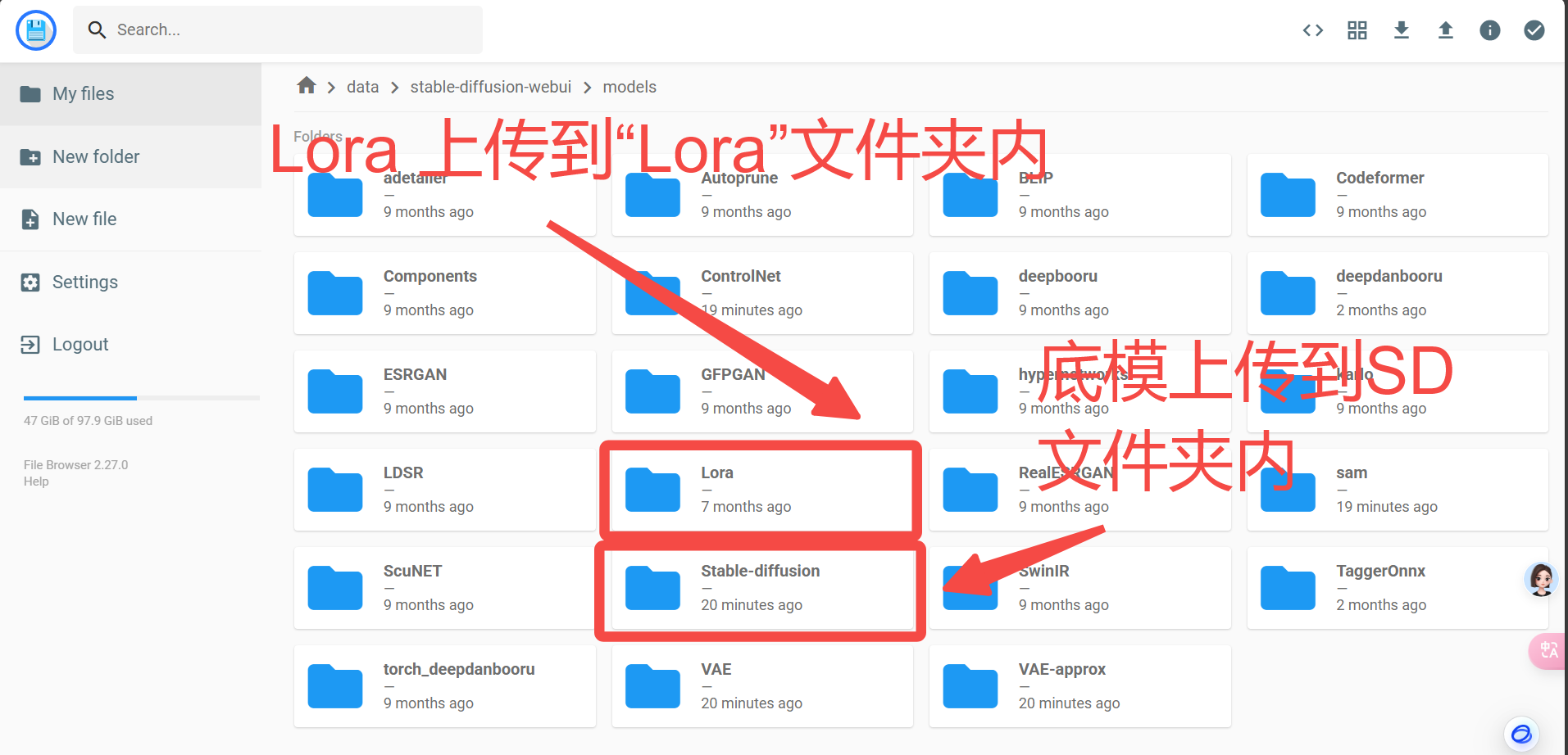 上传Lora:打开“Lora”文件夹上传底模:打开“Stable-diffusion”文件夹