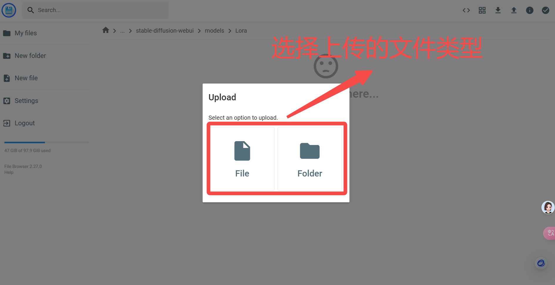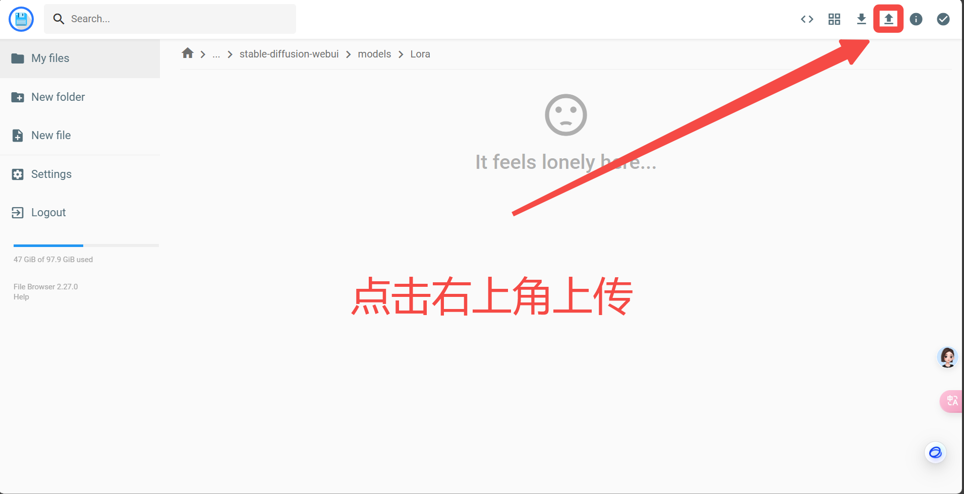 以上传Lora举例,这里我们进入“Lora”文件夹,然后点击右上角上传按键