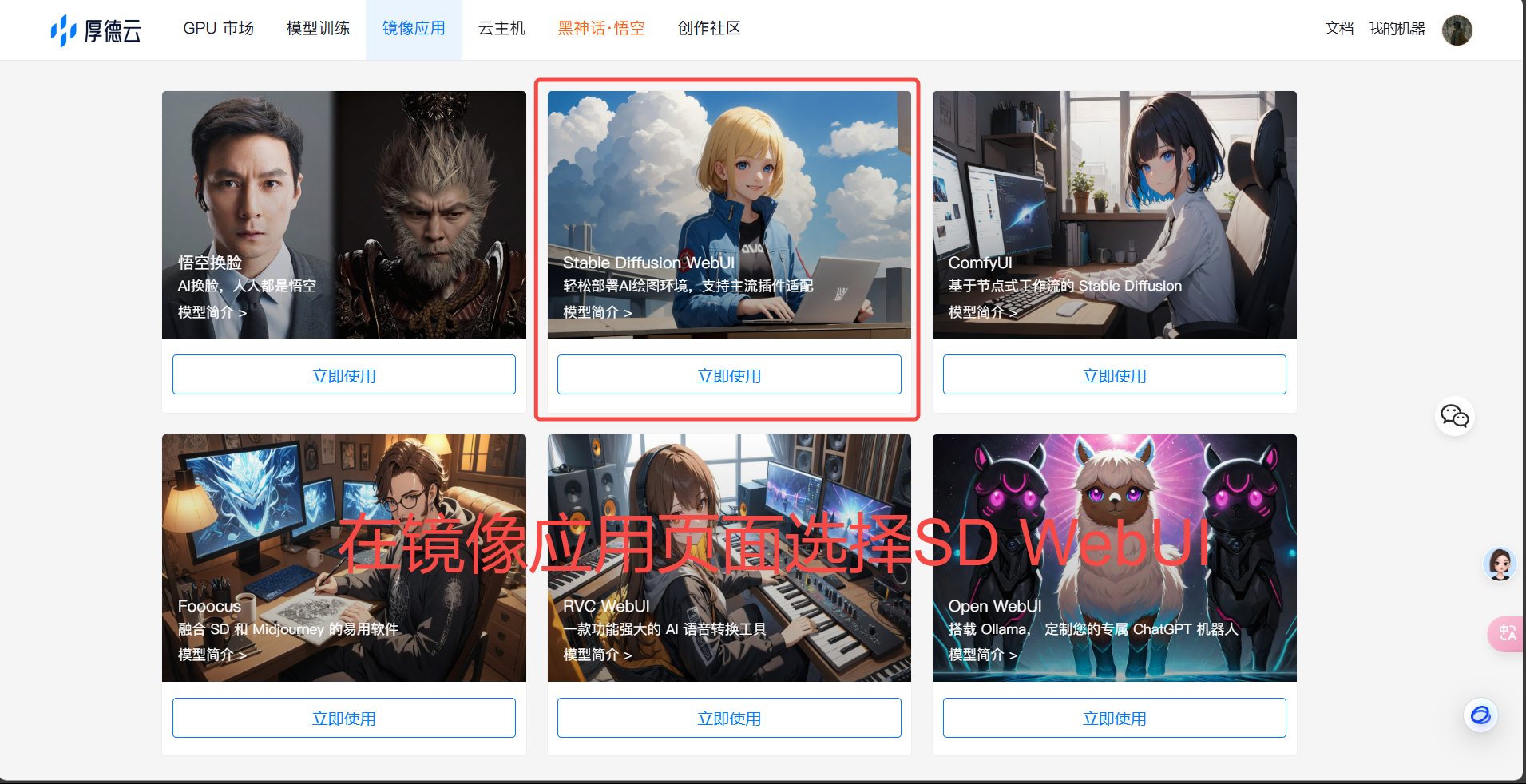 在镜像应用页面中选择Stable Diffusion WebUI