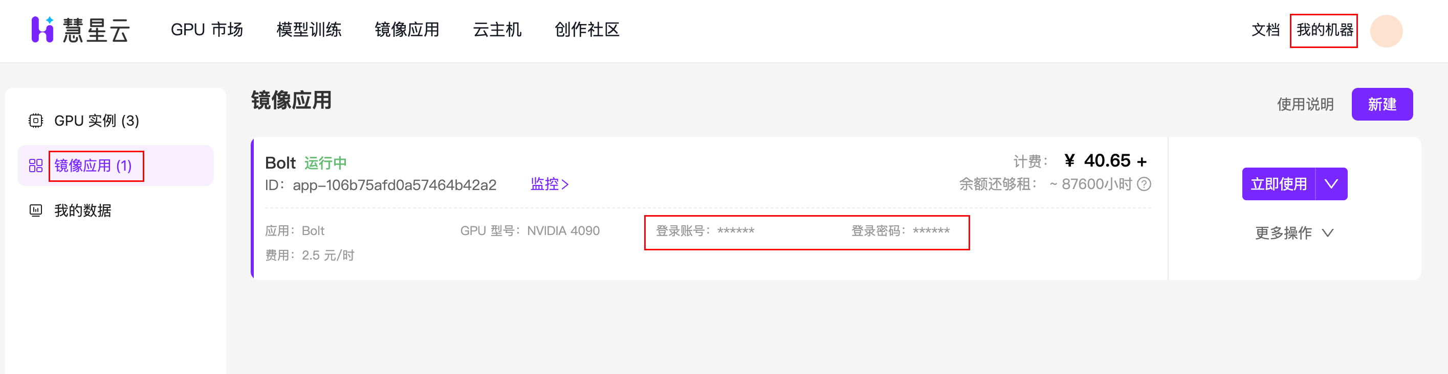 应用创建完成后,可在「我的机器」-「镜像应用」找到处于 运行中 状态的实例,复制卡片上的“登录账号”和“登录密码”,然后点击卡片右侧的“立即使用”。