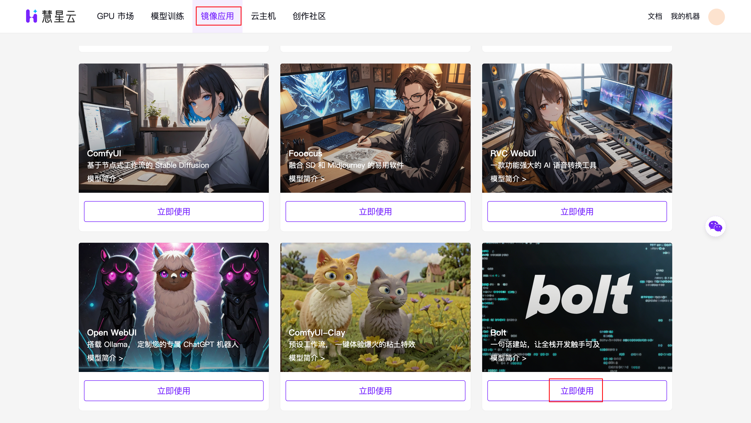在镜像应用内,点击 Bolt 应用卡片,选择 GPU 和计费方式,点击立即下单。