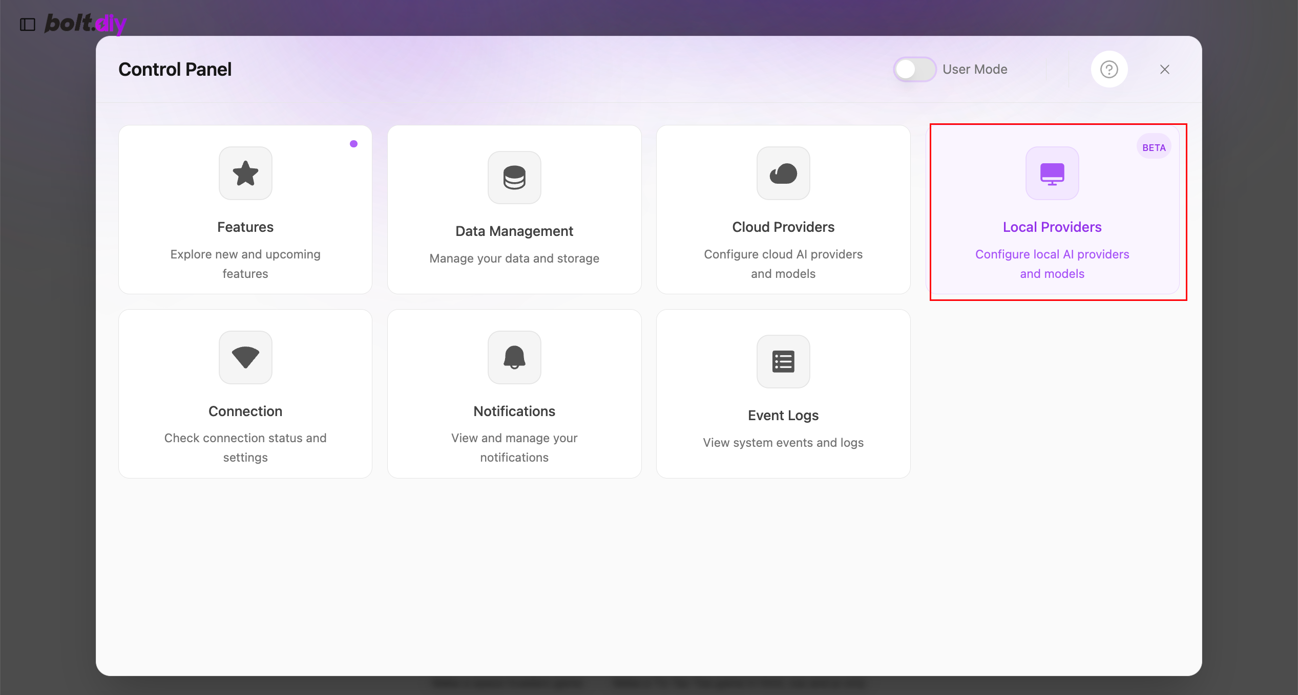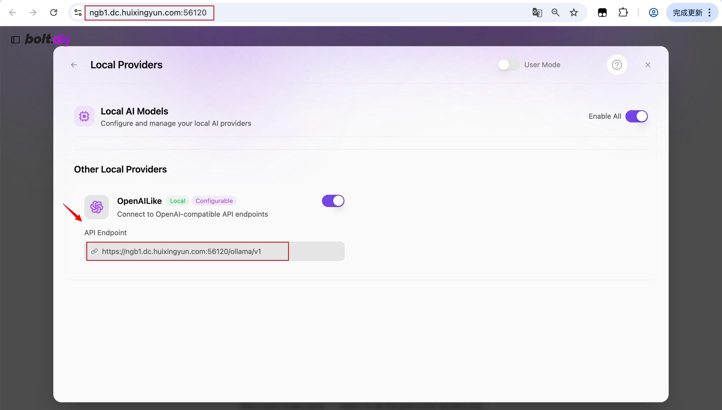 在弹窗内找到“Local Providers”->“OpenAILike”,输入浏览器地址+“ /ollama/v1 ”