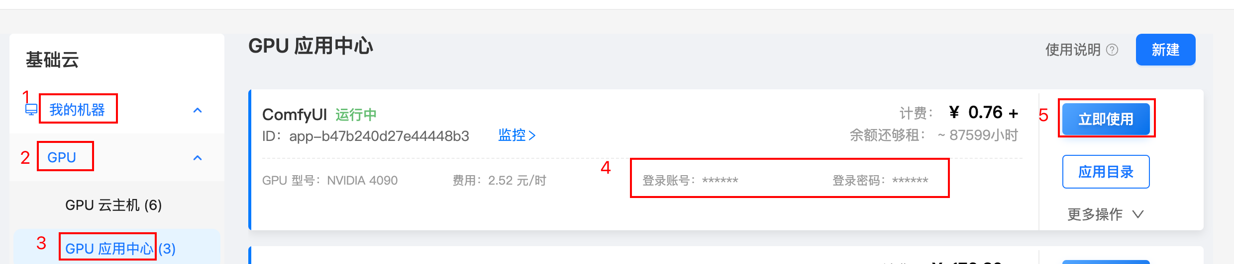 应用创建完成后,可在「我的机器」-「GPU」-「应用中心」找到处于 运行中 状态的实例,复制卡片上的“登录账号”和“登录密码”,然后点击卡片右侧的“进入应用”。