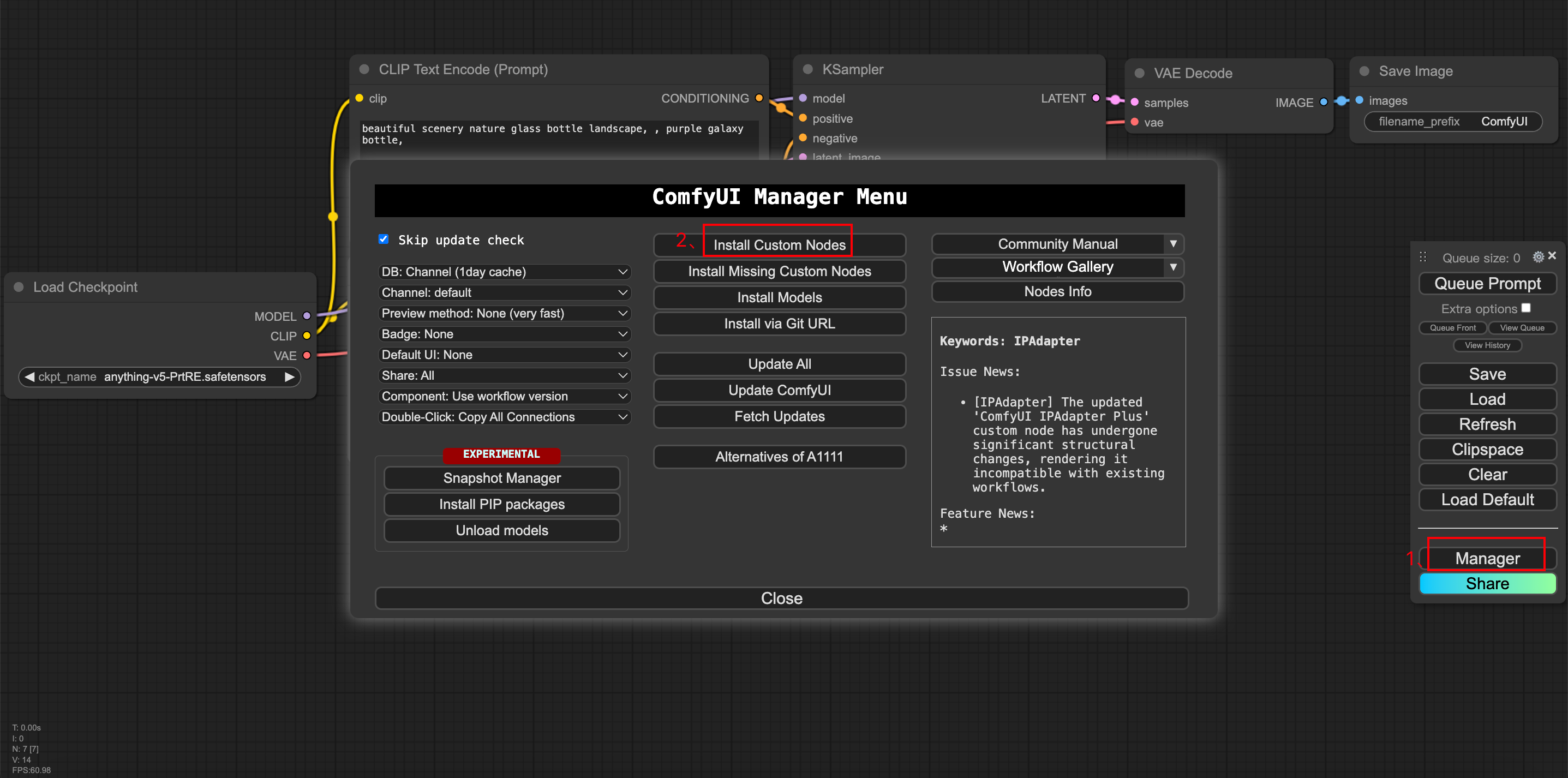 - 点击右侧菜单的"Manager",然后点击"Install Custom Nodes"安装节点。
