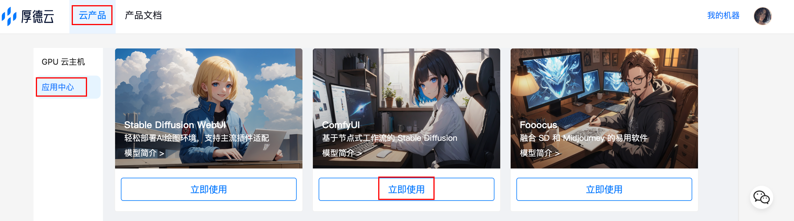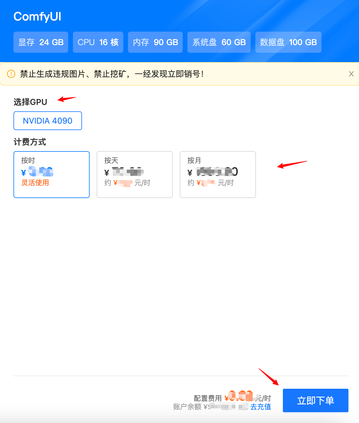 在应用中心内,点击 ComfyUI 应用卡片,选择GPU和计费方式,点击立即下单。