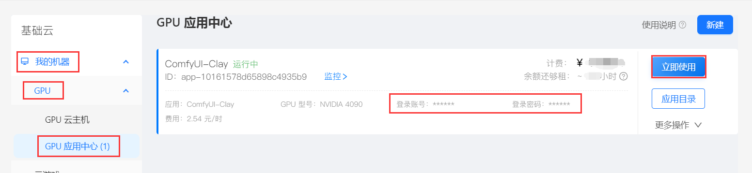 应用创建完成后,可在「我的机器」-「GPU」-「应用中心」找到处于 运行中 状态的实例,复制卡片上的“登录账号”和“登录密码”,然后点击卡片右侧的“进入应用”。