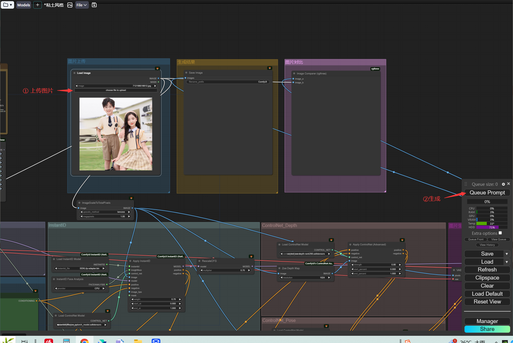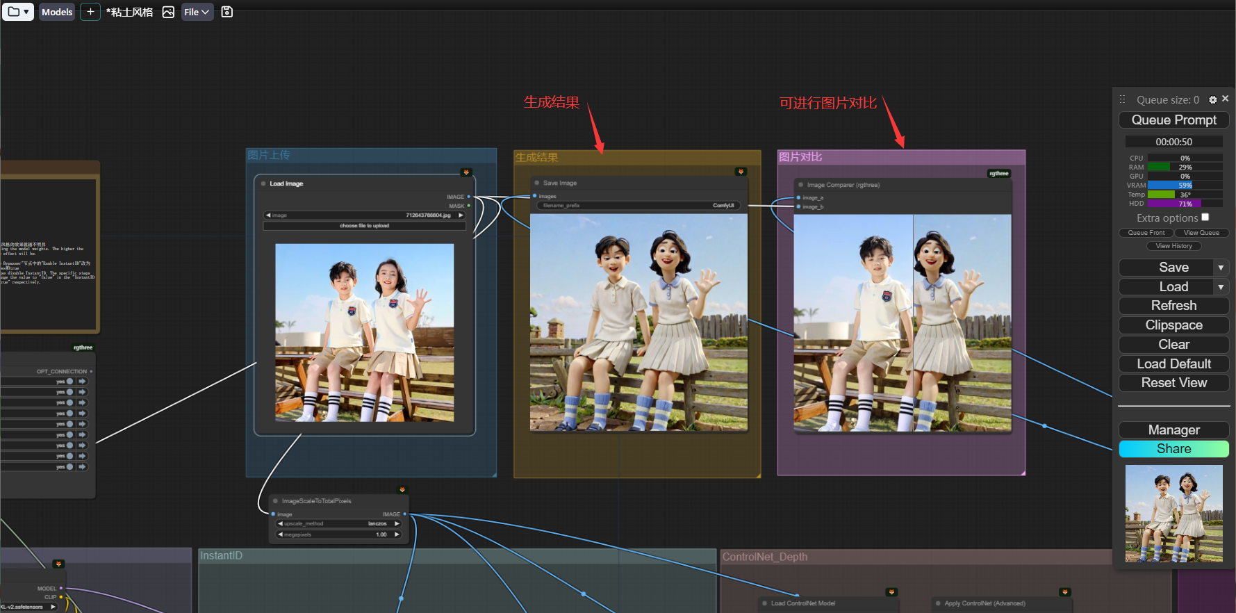 等待工作流运行结束,即可得到粘土风格的图片,并且支持进行前后图片对比