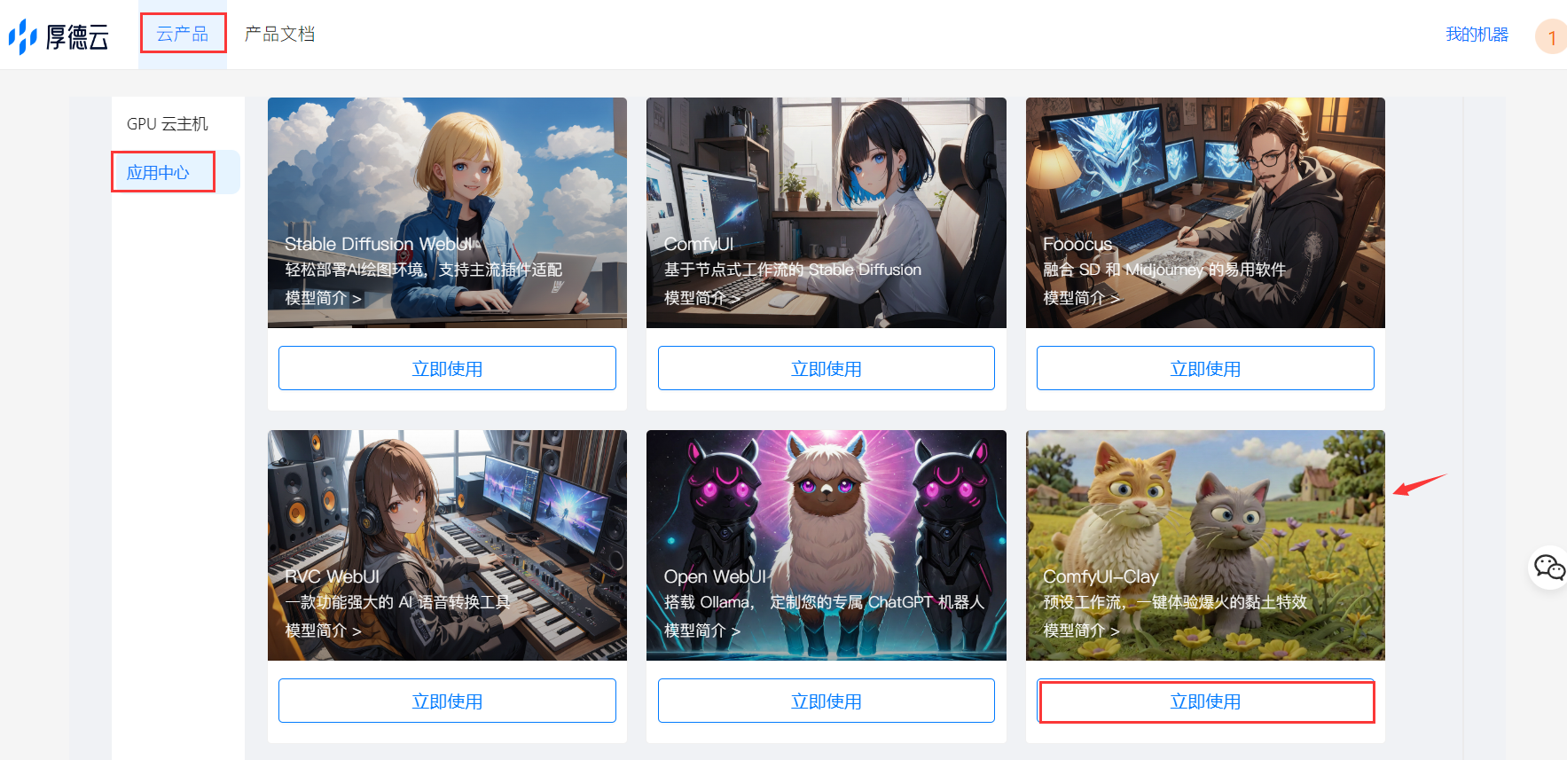 在应用中心内,点击 ComfyUI-Clay 应用卡片,选择 GPU 和计费方式,点击立即下单。