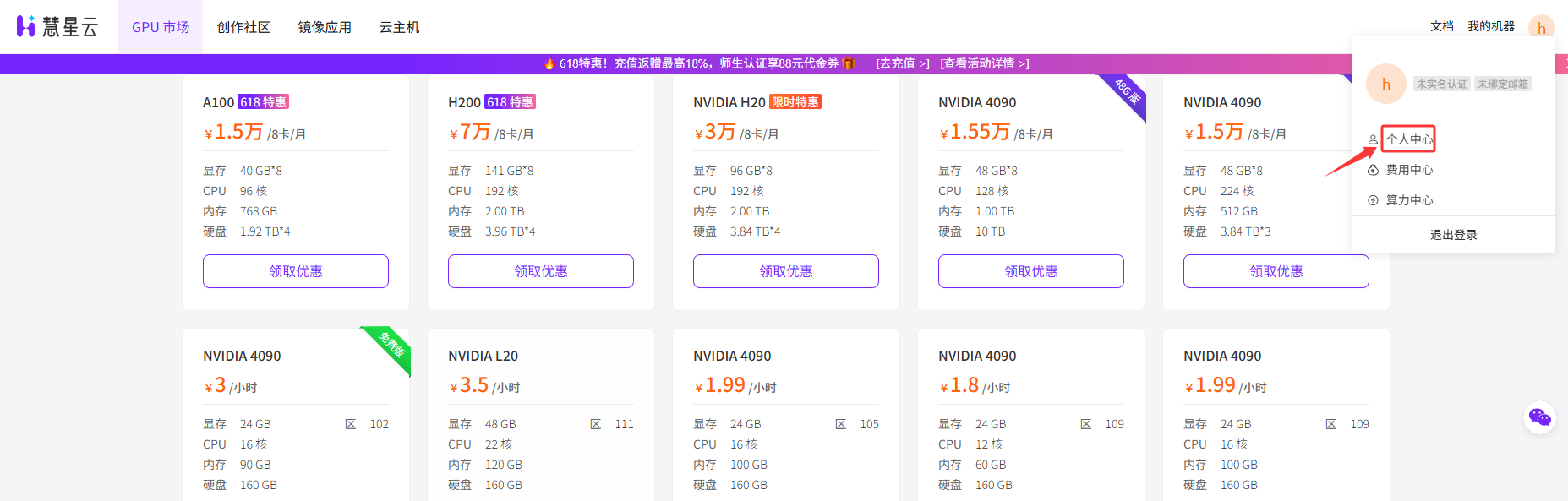 1. 登录慧星云,点击右上角的头像,再次点击弹出框中的【个人中心】,进入个人中心页面。