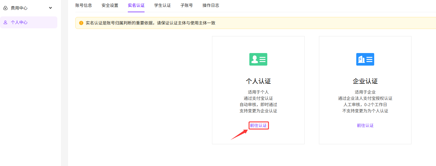 3. 选择【个人认证】方式,点击【前往认证】进入个人实名认证页