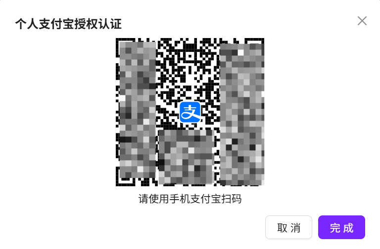5. 点击【确定】按钮,系统弹出个人支付宝授权认证二维码页面,使用手机支付宝扫码并完成认证。