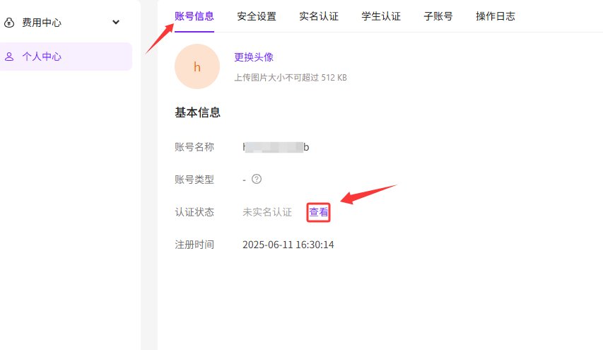 2. 选择账号信息页面中的【认证状态】,若未认证,点击【查看】跳转到实名认证页面;